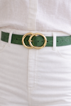Ceinture en simili cuir camel texturé, dotée d’une boucle double anneau doré. Un basique raffiné aux finitions soignées, idéal pour apporter une touche chaleureuse à vos tenues.