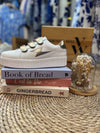 - Découpe en forme d'éclair et contrefort en similicuir texturé or champagne