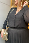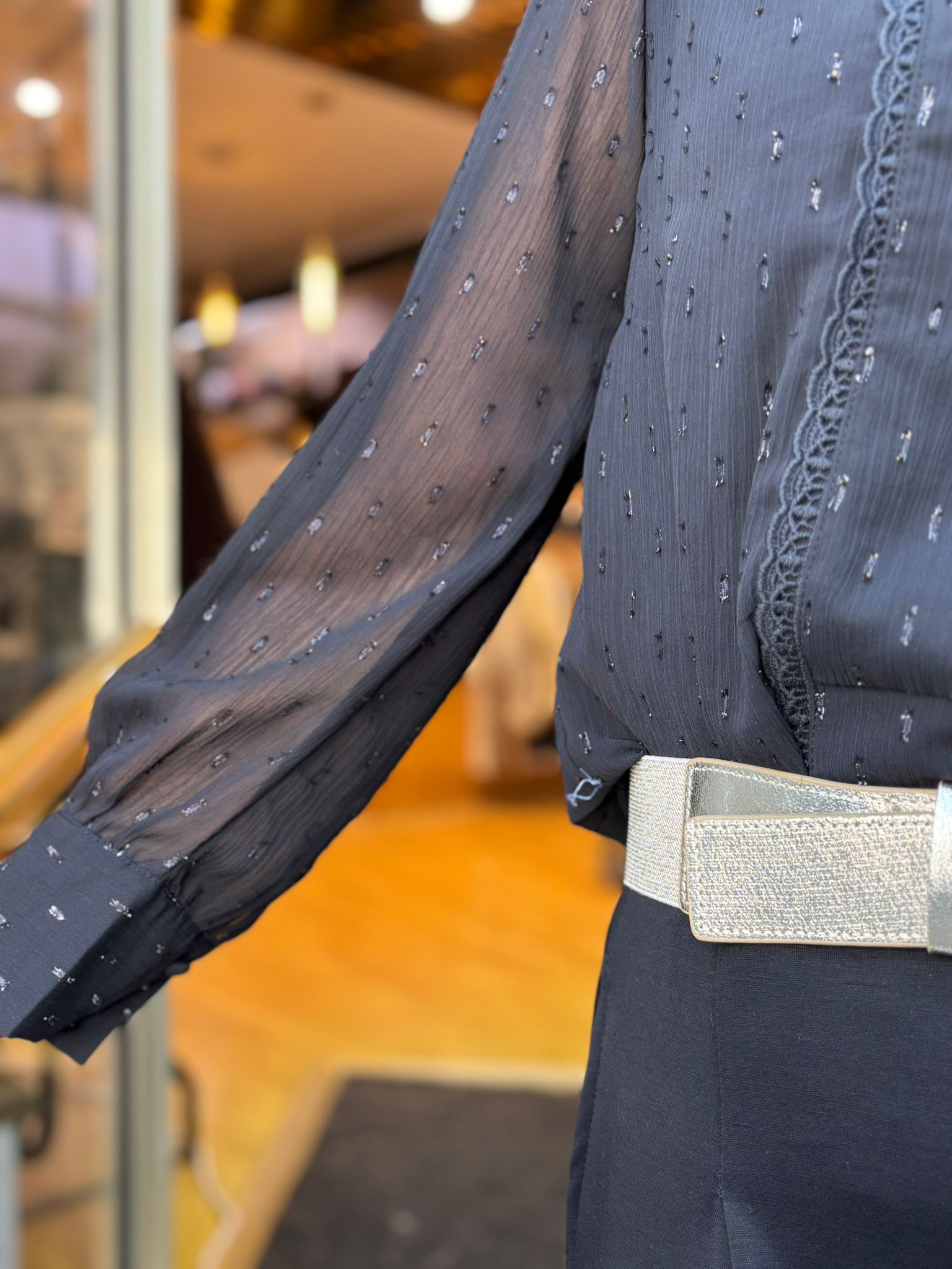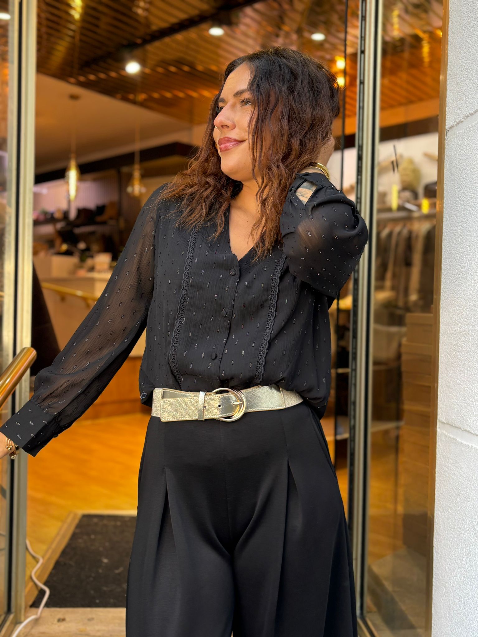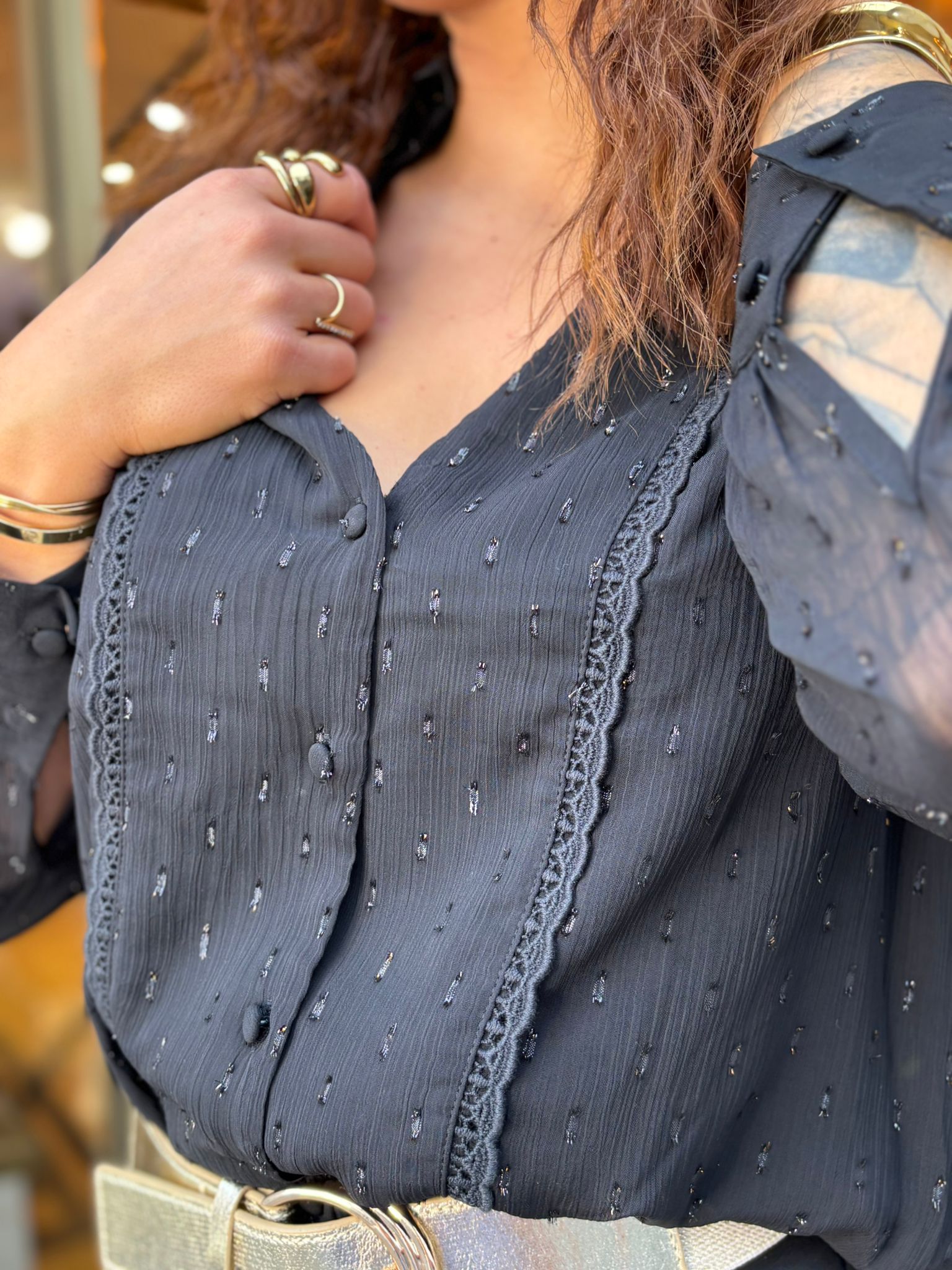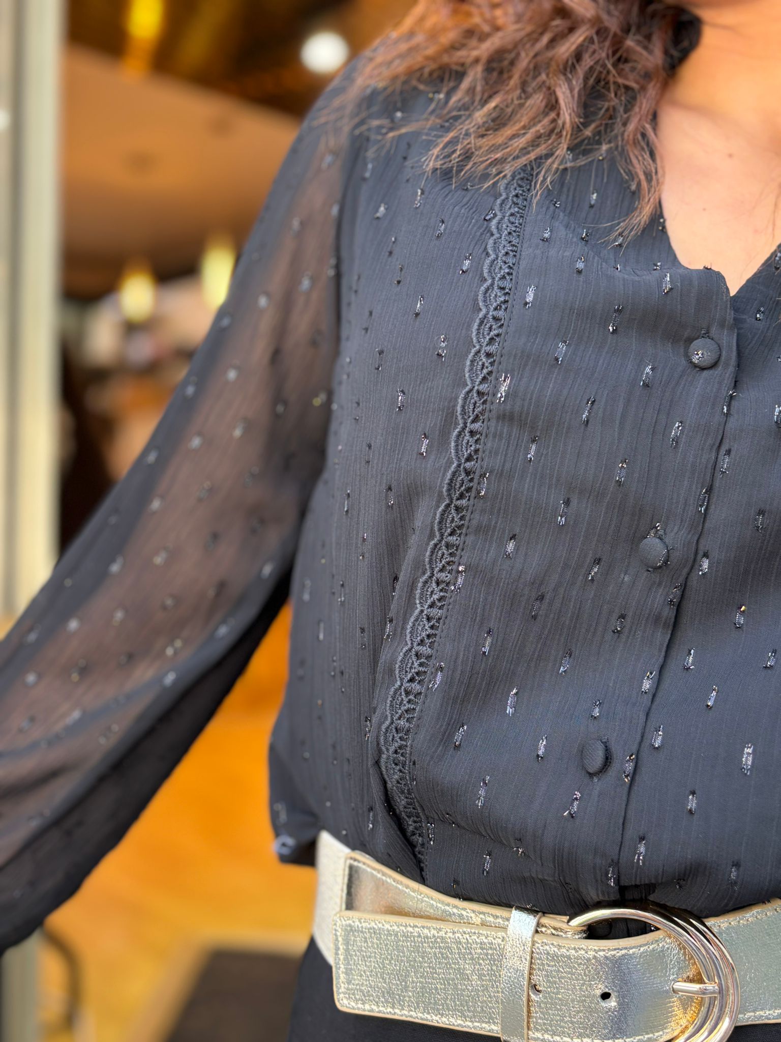 Optez pour l’élégance avec ce chemisier noir au tissu léger et délicatement texturé. Parsemé de petits motifs brillants, il apporte une touche subtile de luminosité à votre tenue. Son col et sa patte de boutonnage sont ornés d’une fine dentelle, offrant un charme romantique et raffiné.