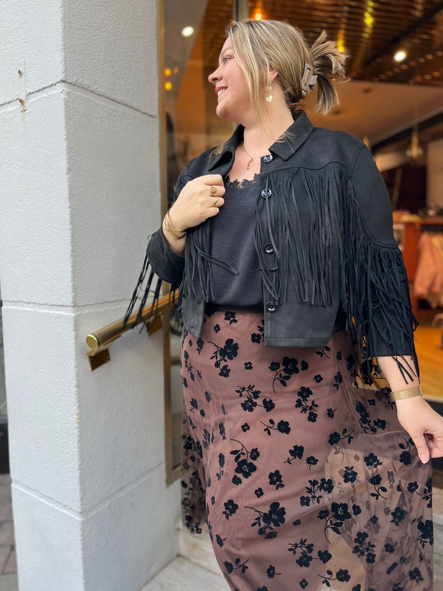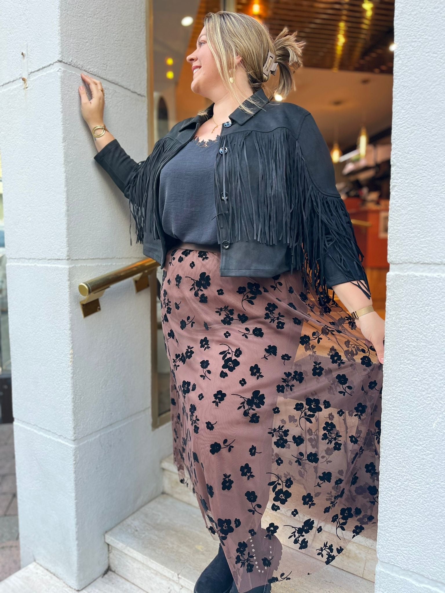 Légère, élégante et pleine de charme, cette jupe longue est un indispensable pour toutes les silhouettes. Son tissu fluide et son voile de tulle délicatement brodé de motifs floraux noirs apportent une touche de romantisme et de raffinement à votre tenue.
