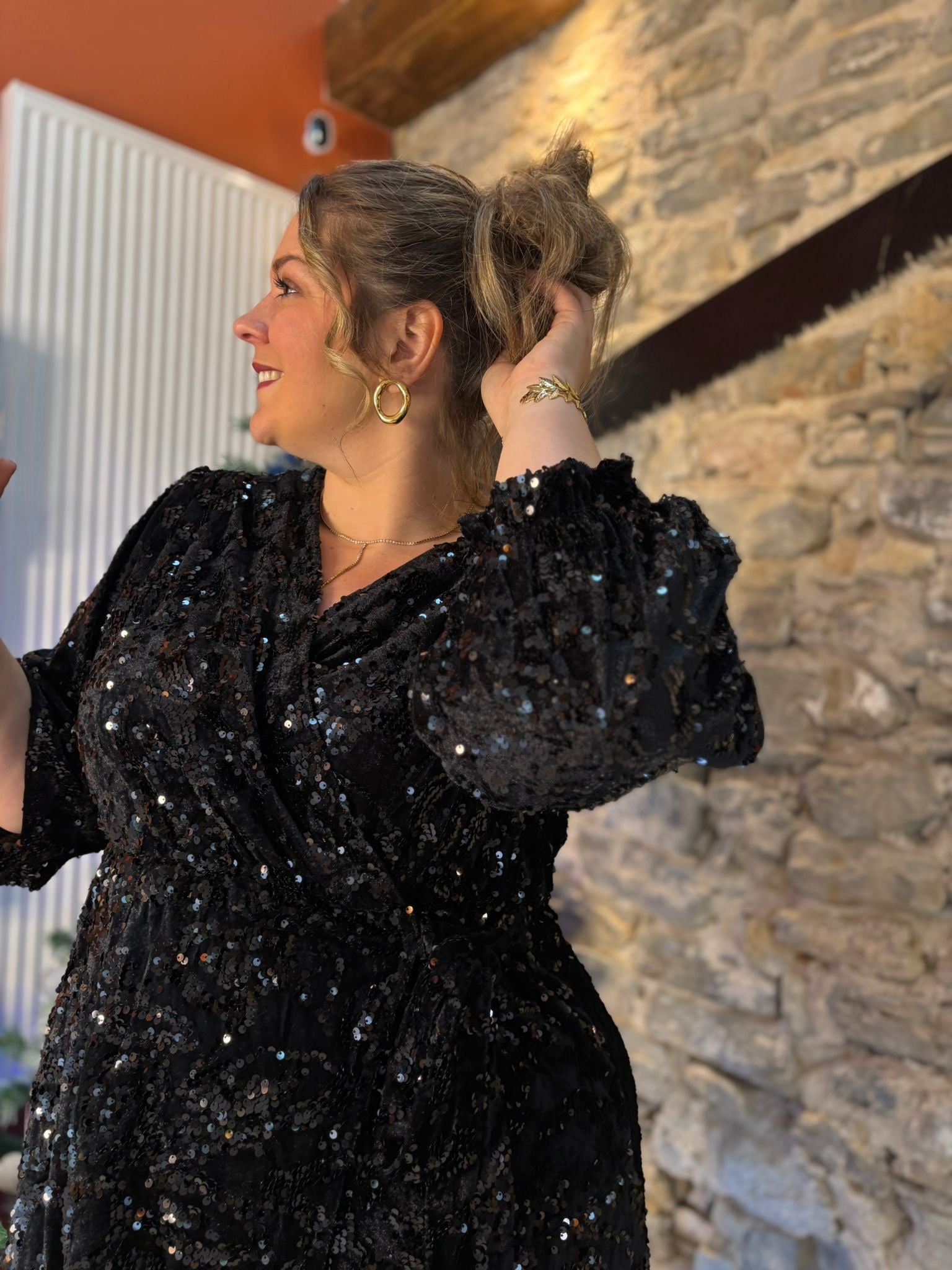 Les manches longues légèrement bouffantes apportent une touche de sophistication et ajoutent du mouvement à chaque geste. Fluide, scintillante et confortable, cette robe est parfaite pour les soirées, fêtes et événements où vous souhaitez faire sensation.