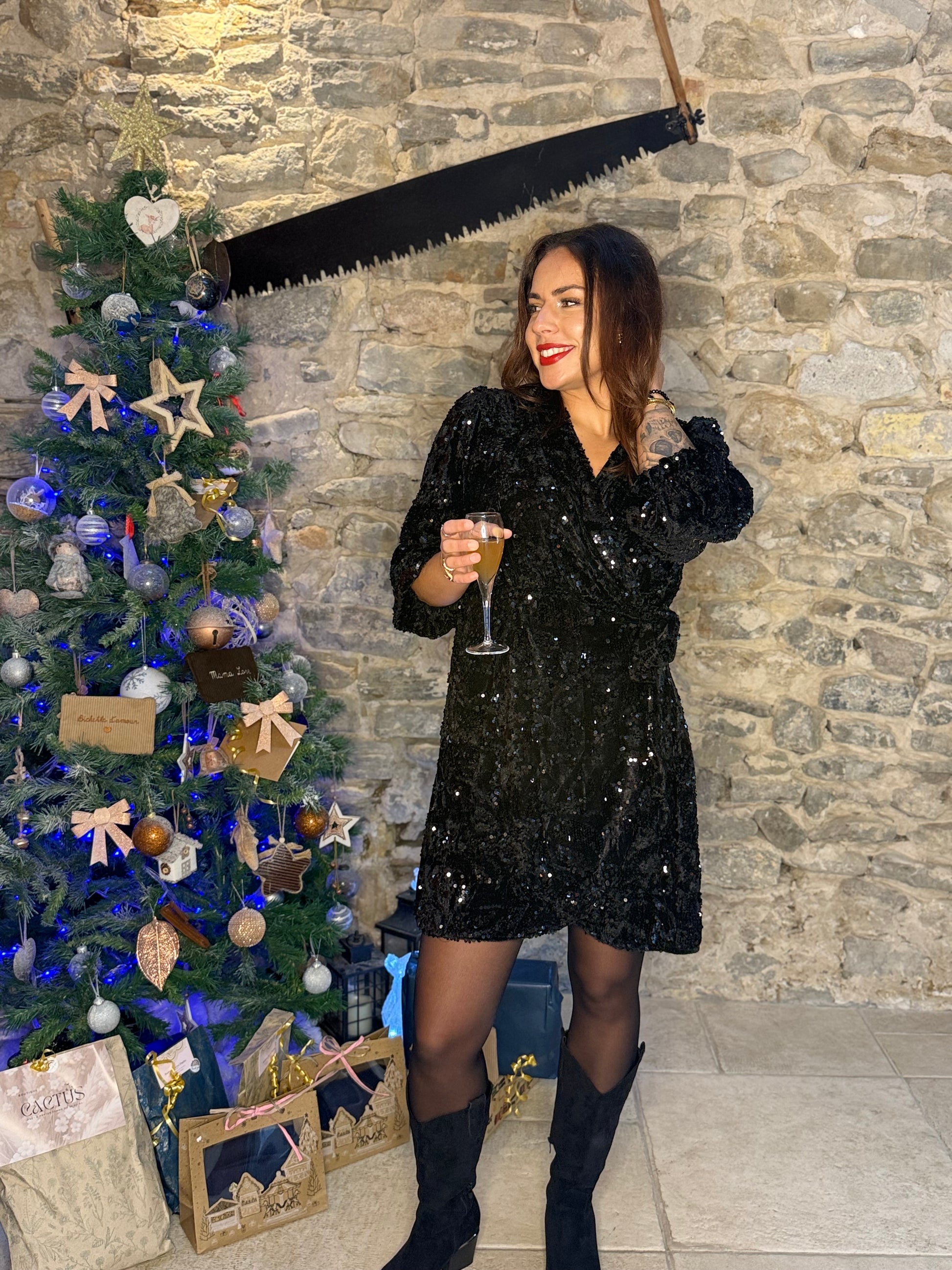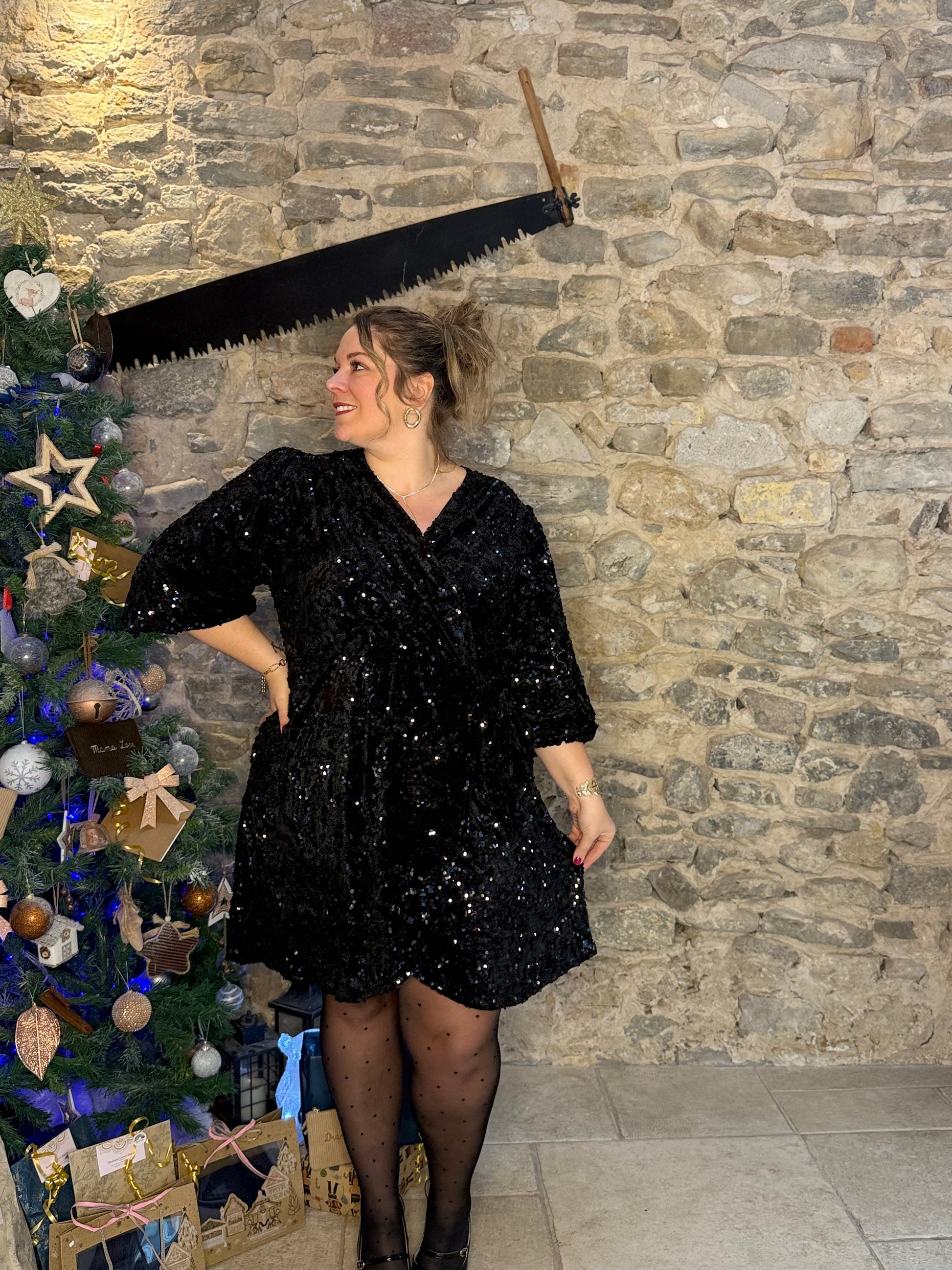 Brillez de mille feux avec cette superbe robe courte portefeuille entièrement recouverte de sequins noirs. Sa coupe croisée met délicatement en valeur la poitrine, tandis que la ceinture à nouer souligne la taille pour une silhouette élégante et féminine.