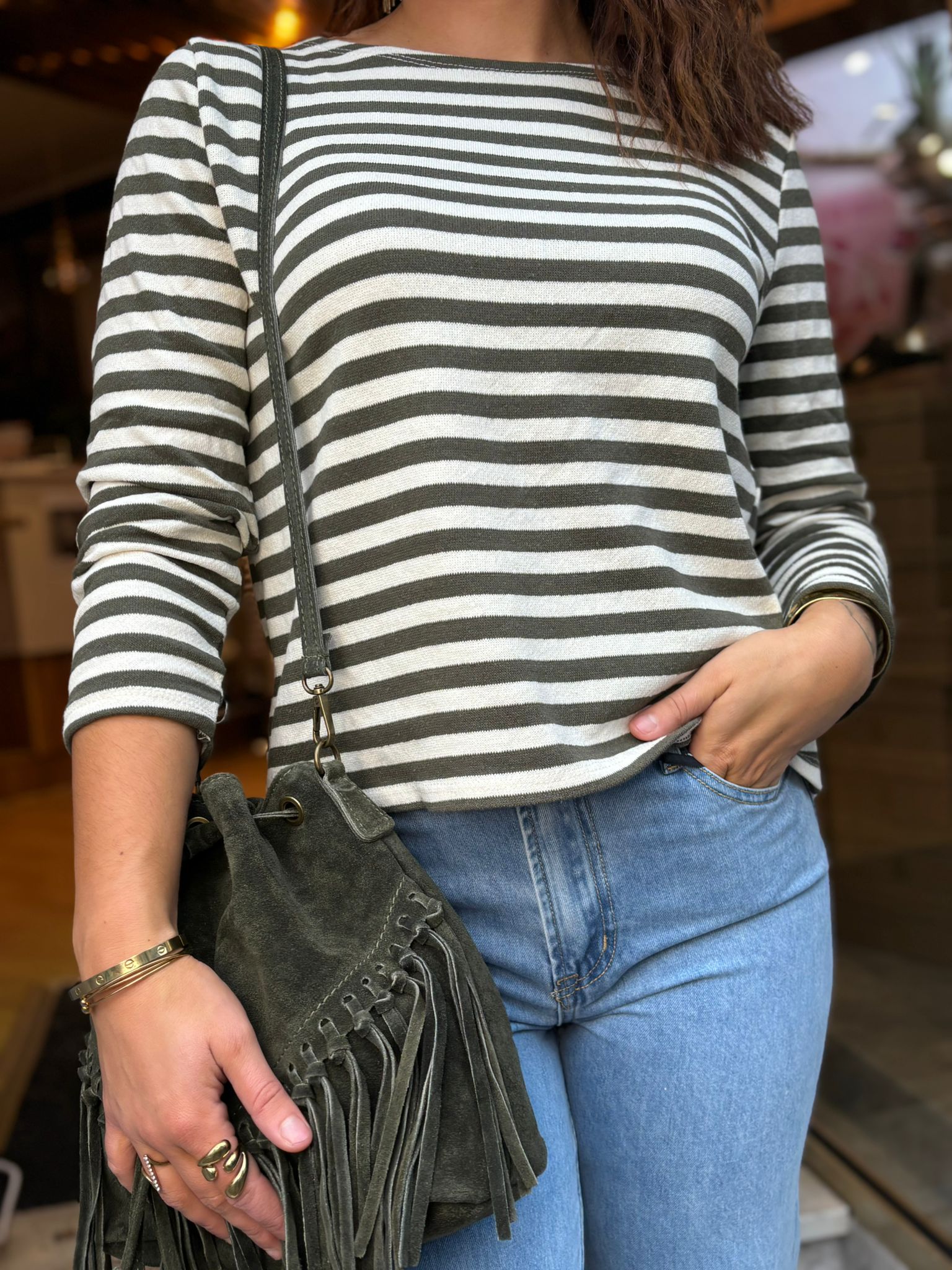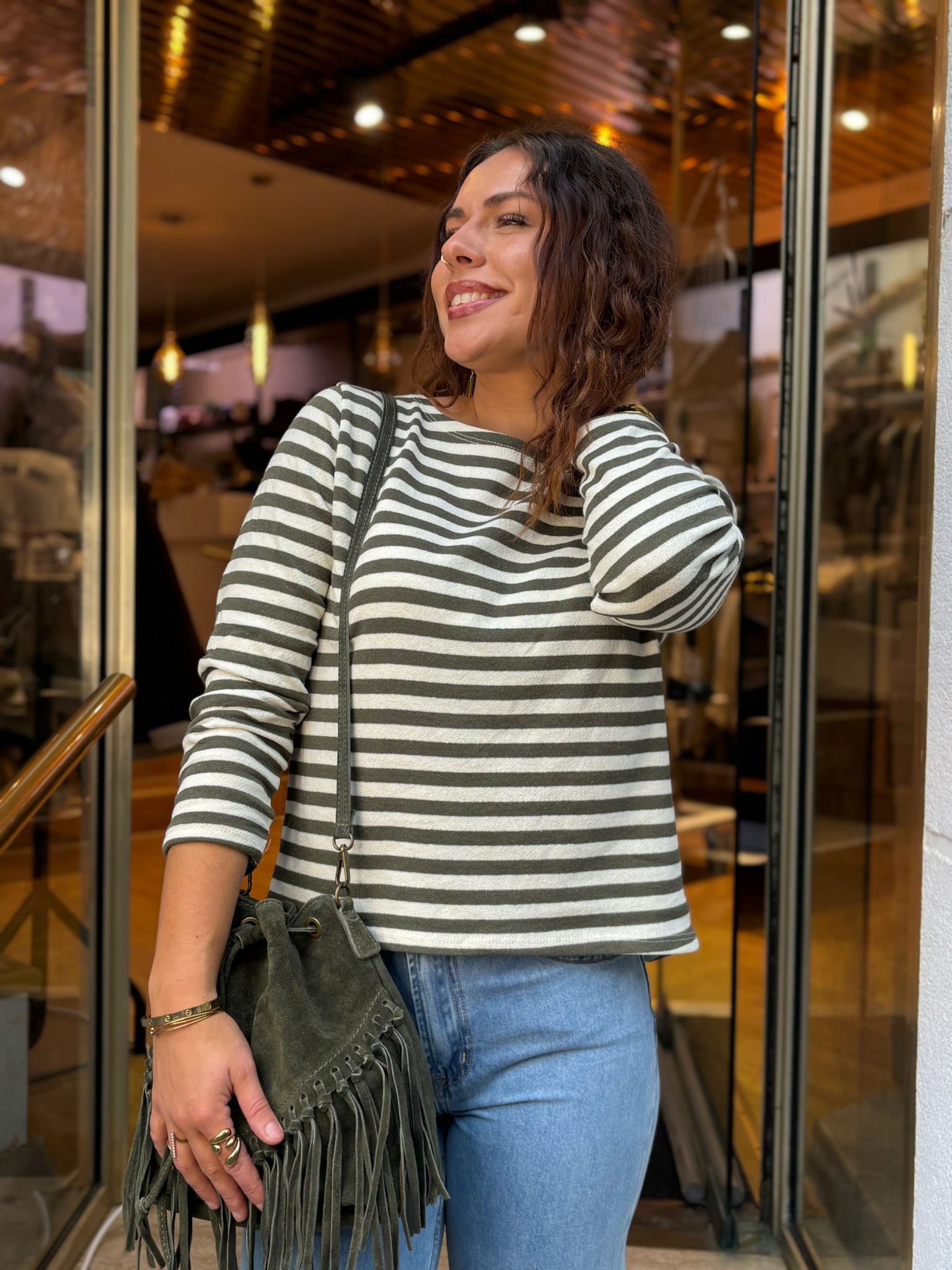 Laissez-vous séduire par ce pull rayé dans des tons kaki et écru, parfait pour apporter une touche naturelle et moderne à vos tenues du quotidien. Sa maille douce et souple offre un confort idéal, tandis que sa coupe légèrement ample s’adapte harmonieusement aux silhouettes allant du 36 au 44.