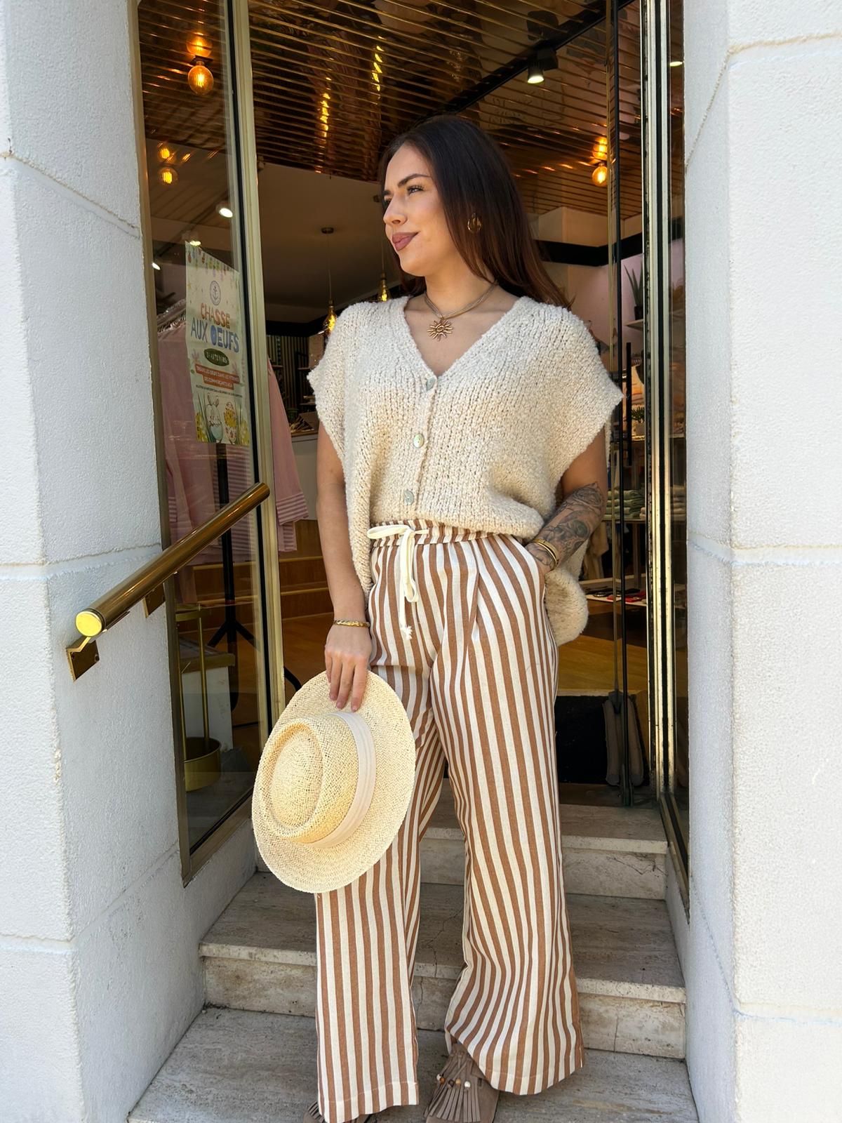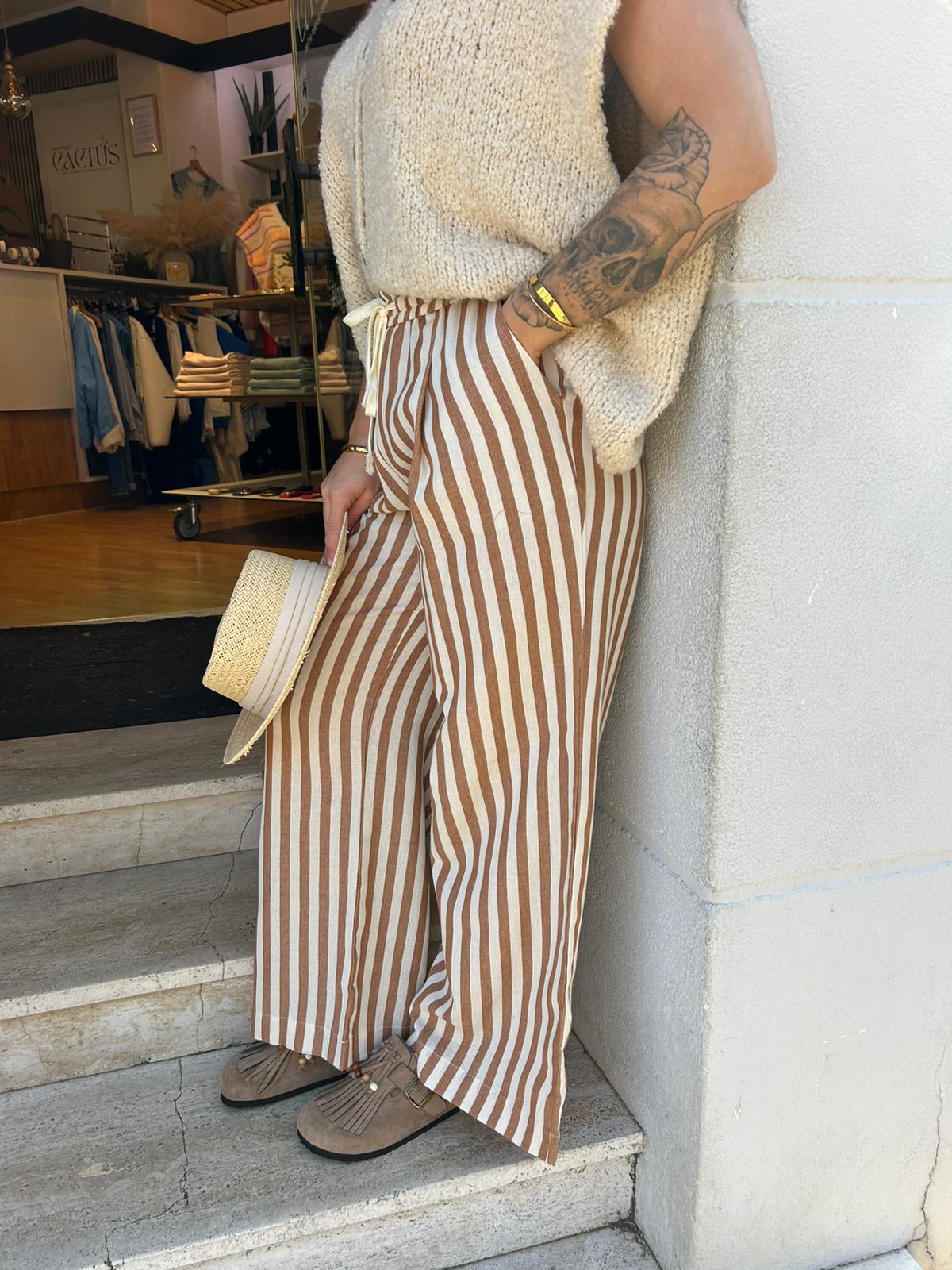 Adoptez un style à la fois confortable et élégant avec ce pantalon fluide à rayures. Sa taille haute élastique avec cordon de serrage assure un ajustement parfait tout en offrant un grand confort. Sa coupe ample et légère en fait une pièce idéale pour la saison estivale, facile à associer avec un top ou une blouse pour un look chic et décontracté.