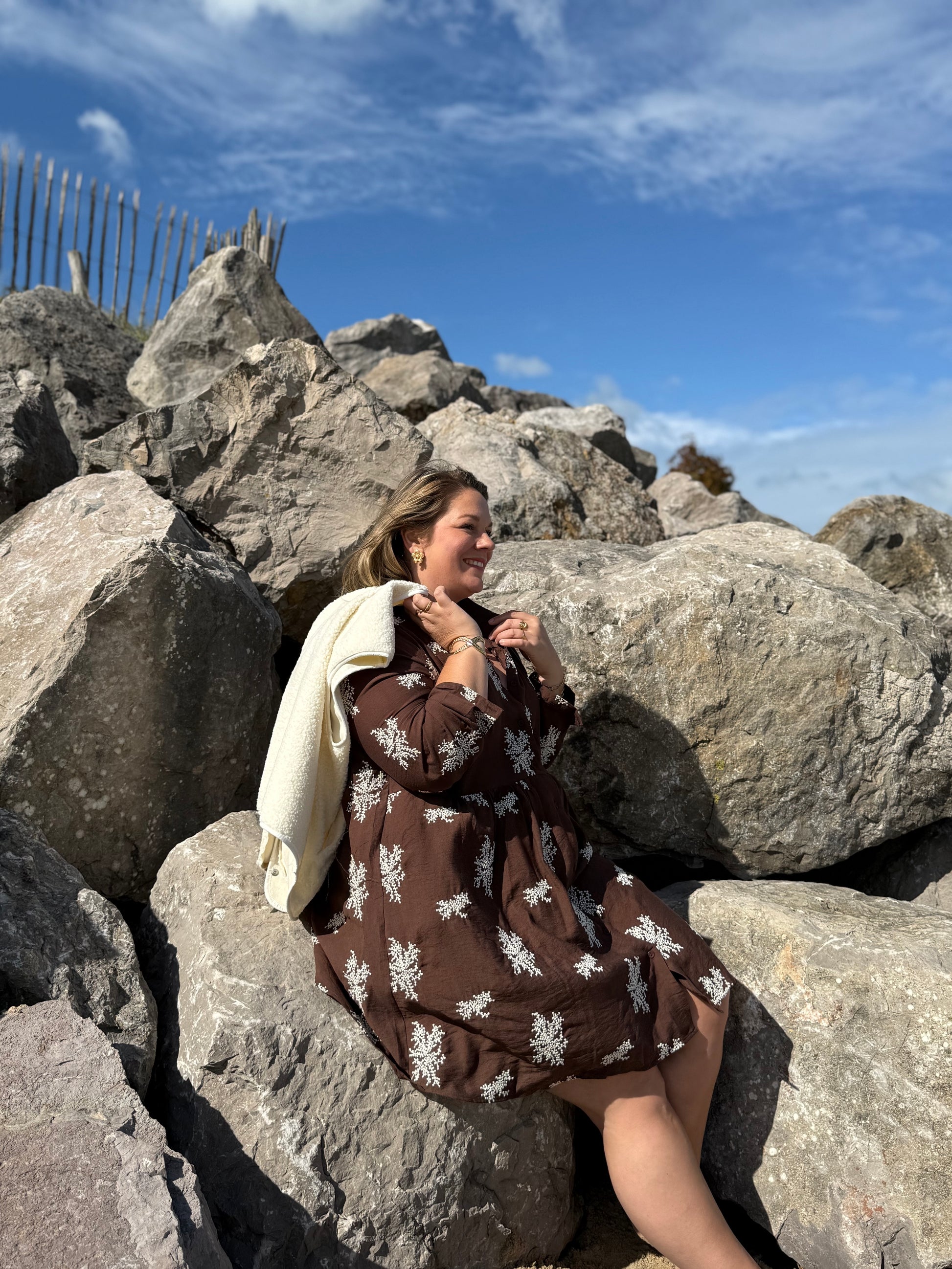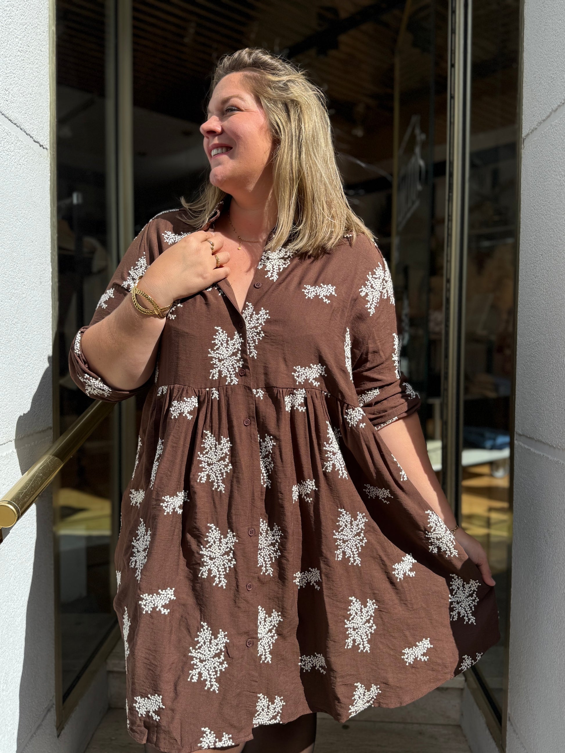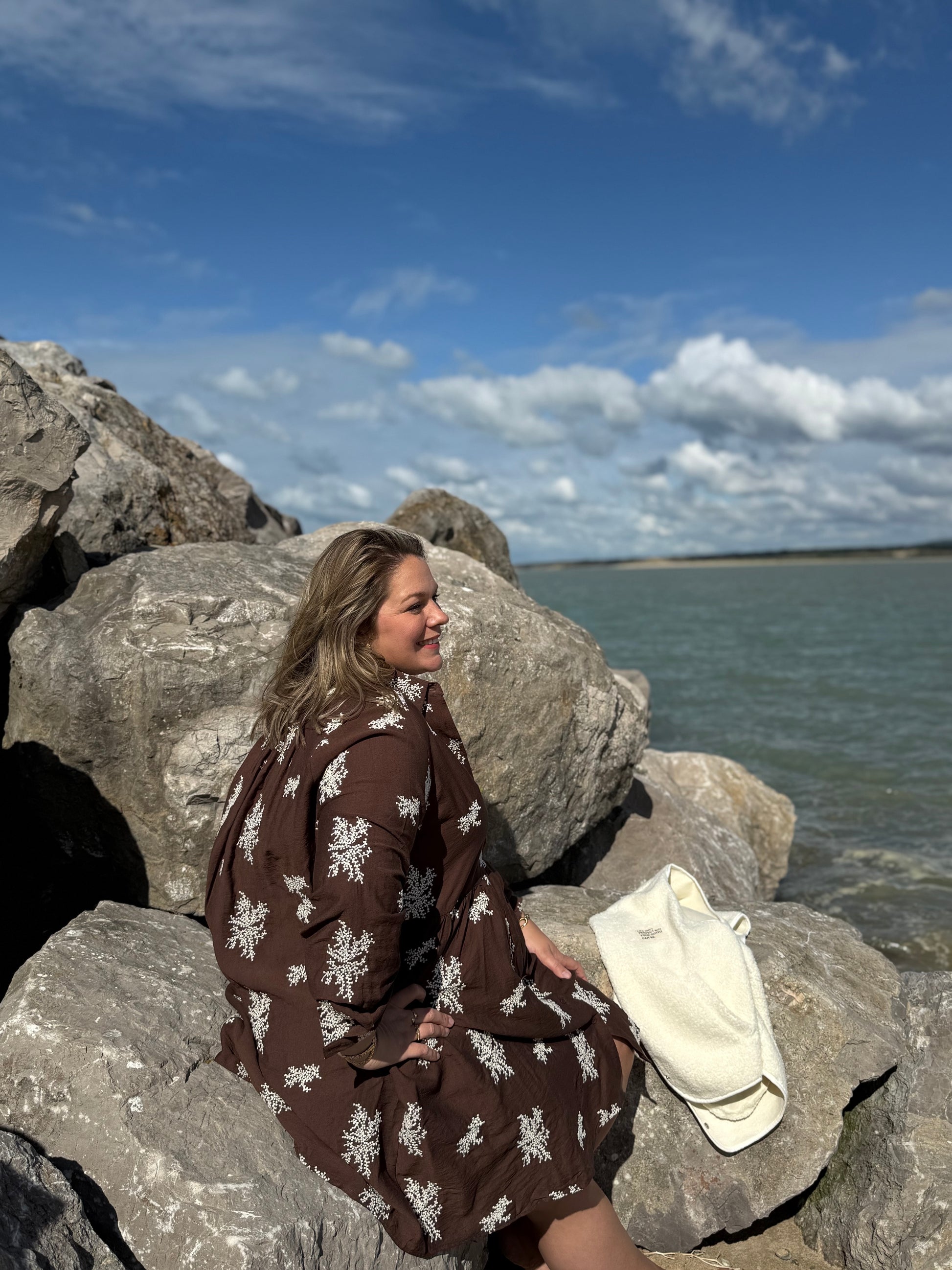 • Couleur : chocolat, réhaussée de délicats motifs brodés en blanc cassé