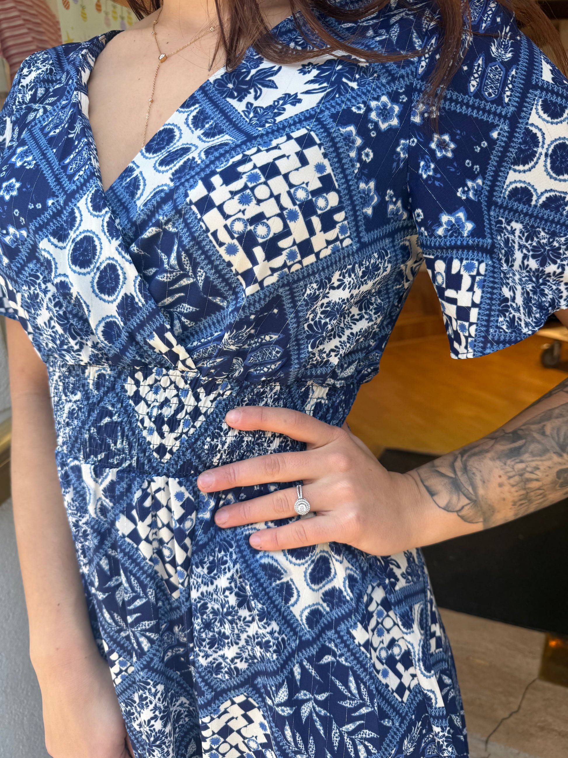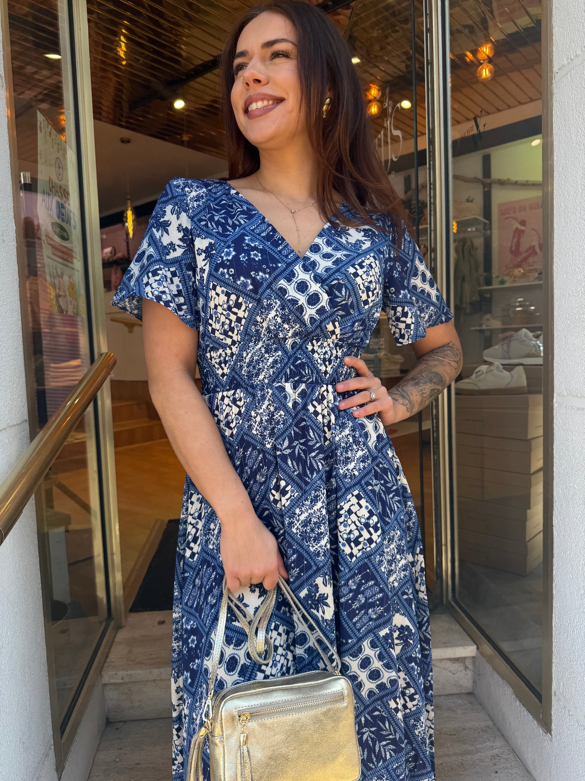 Robe longue fluide à imprimé patchwork bleu et blanc, inspirée d’un style bohème chic et intemporel. Son décolleté en V met en valeur le buste, tandis que ses manches courtes volantées apportent une touche féminine et légère. La taille souligne la silhouette tout en offrant un confort optimal, et sa jupe ample crée un joli mouvement à chaque pas.