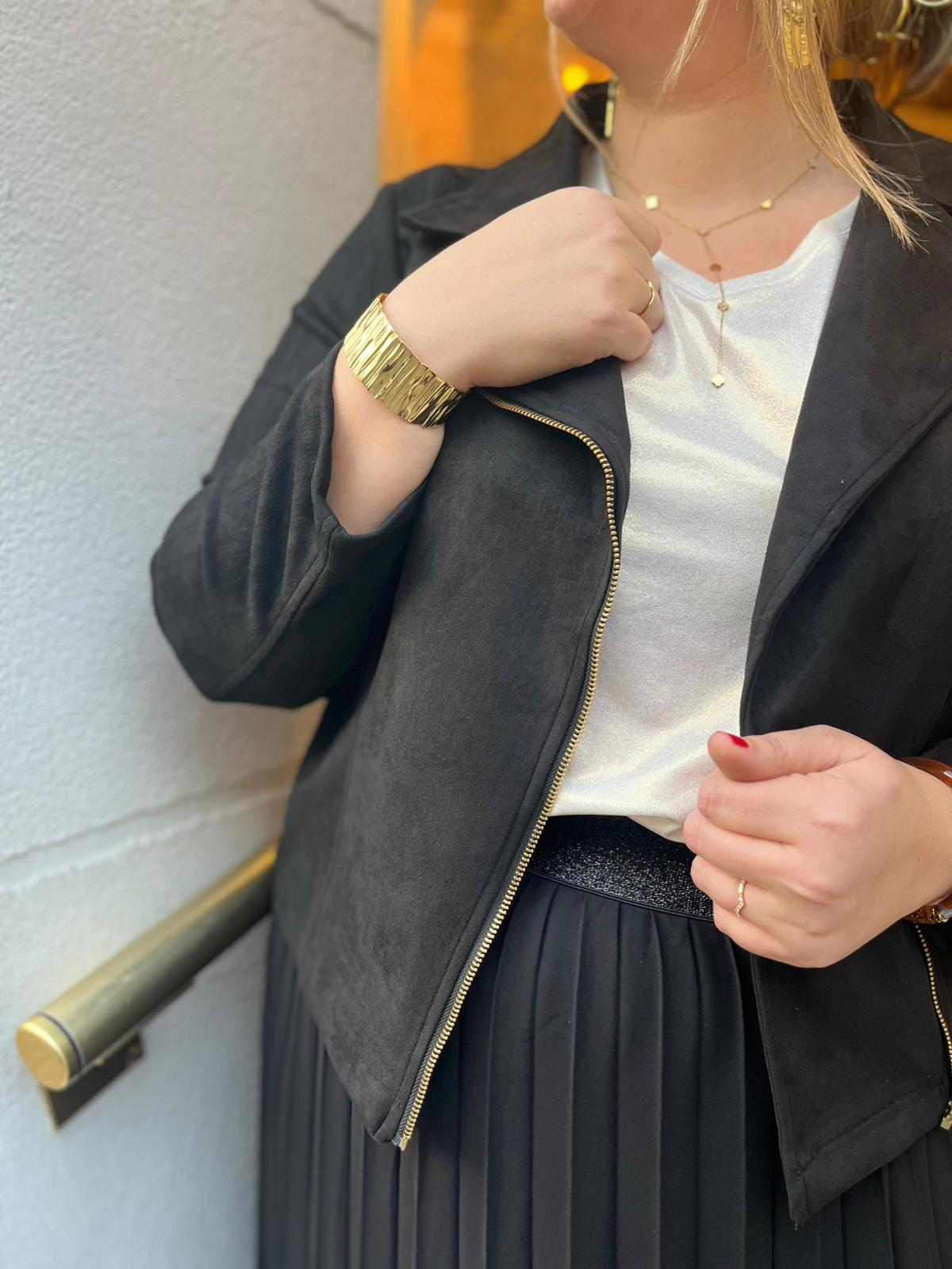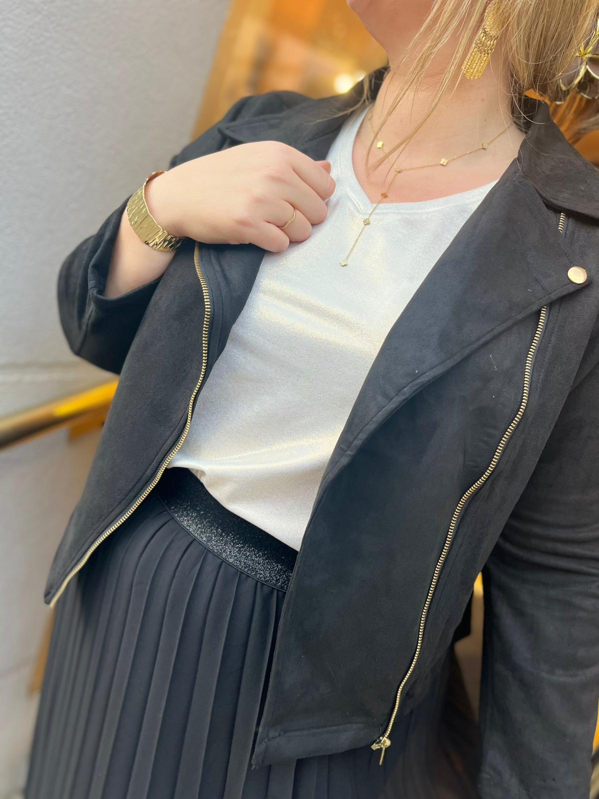 Léger, élégant et ultra confortable, ce T-shirt scintillant est la pièce parfaite pour illuminer toutes vos tenues. Sa matière douce et légèrement brillante apporte une touche chic sans en faire trop. Grâce à sa coupe fluide et à son tissu extensible, il convient parfaitement jusqu’à une taille 48, tout en offrant une belle aisance.
