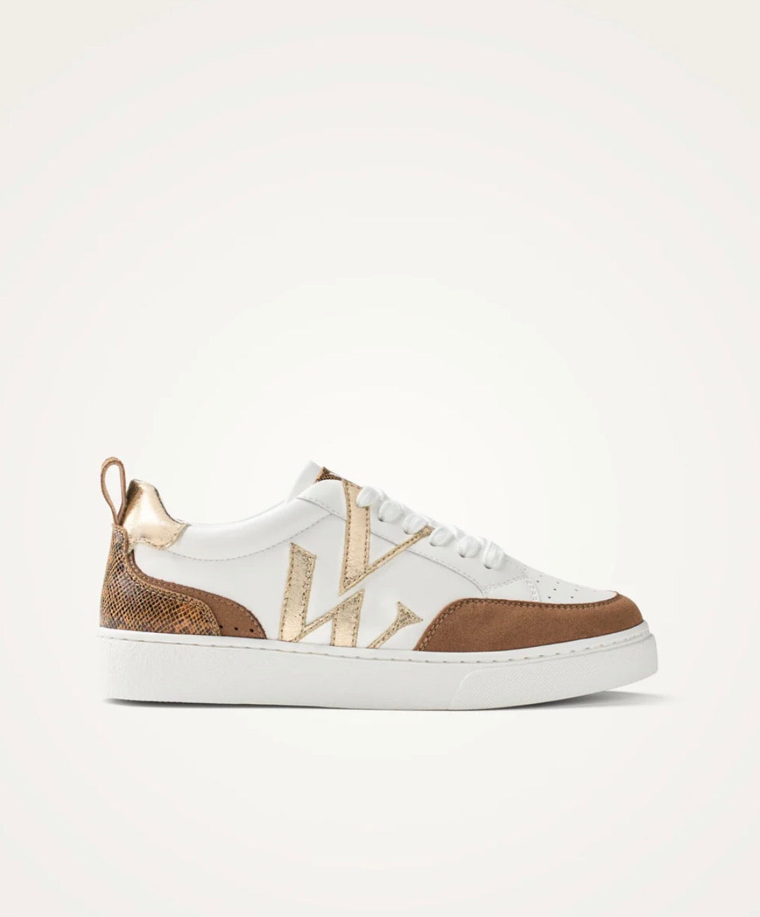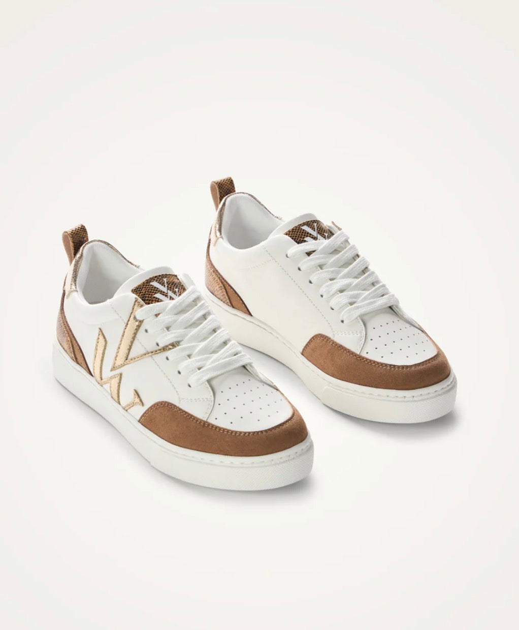 Baskets blanches au style urbain chic, rehaussées d’empiècements camel et d’un éclair doré sur le côté. Semelle épaisse pour un confort optimal et un maintien parfait au quotidien. Un modèle tendance et polyvalent, idéal pour compléter aussi bien une tenue casual qu’un look plus soigné.