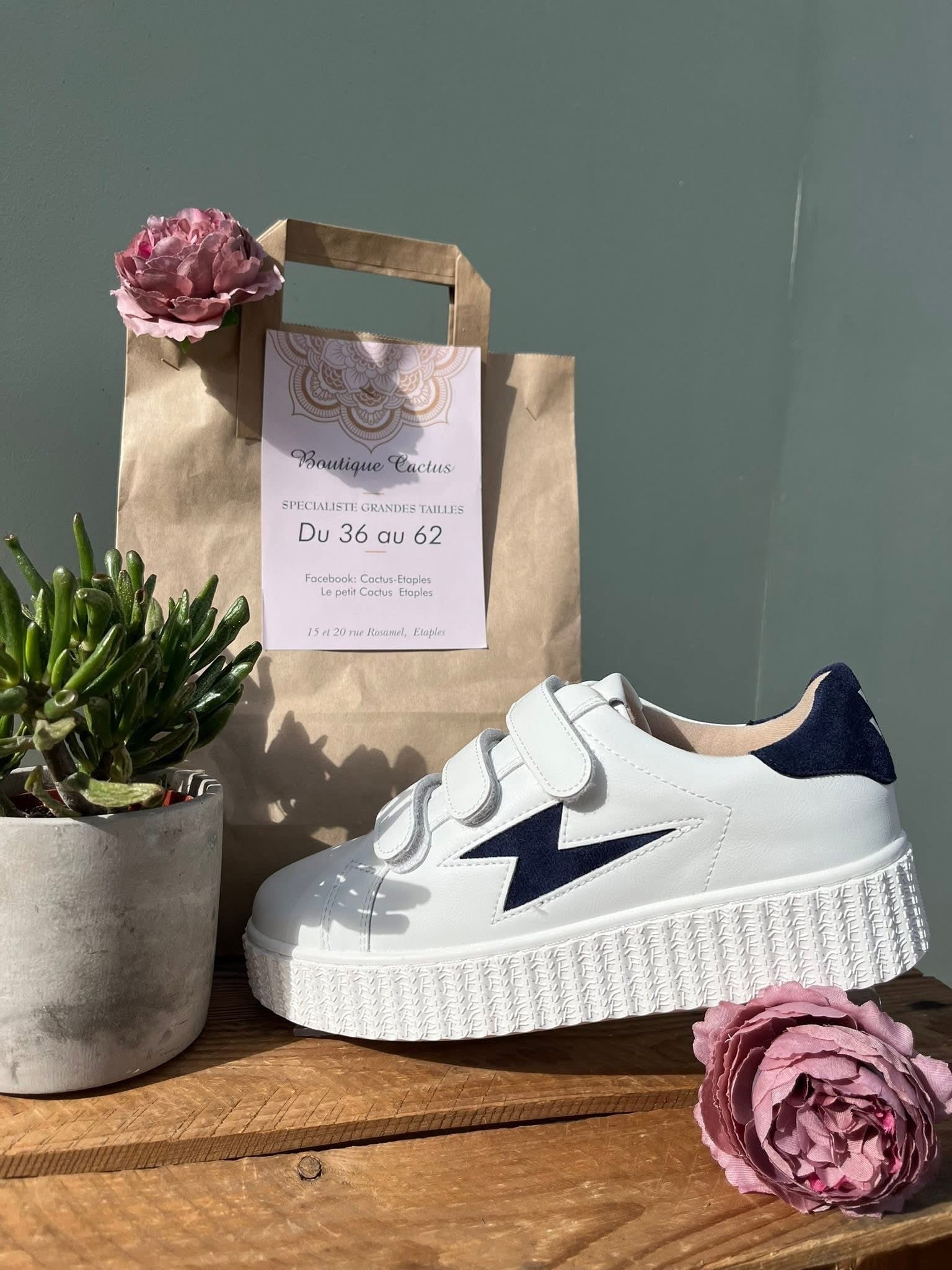 Baskets blanches à plateforme avec fermeture par scratch pour un confort optimal. Détail éclair bleu marine sur le côté et talon assorti pour une touche moderne et raffinée. Un modèle facile à porter, parfait pour un look casual chic au quotidien.